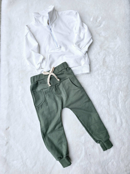 Boys 2 PC Set - 1/2 Zip White Sweatshirt + Green Pants