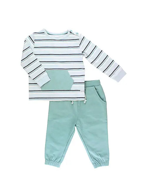 Dress your little man in style with the Cool Blue Jogger Set from Rugged Butts! Designed for active boys, this set combines fashion and comfort effortlessly. The ensemble includes comfortable jogger-style bottoms paired with a soft tee featuring a stylish stripe pattern. Whether you're exploring the park or enjoying a day at home, your baby boy will be the epitome of adorable charm!