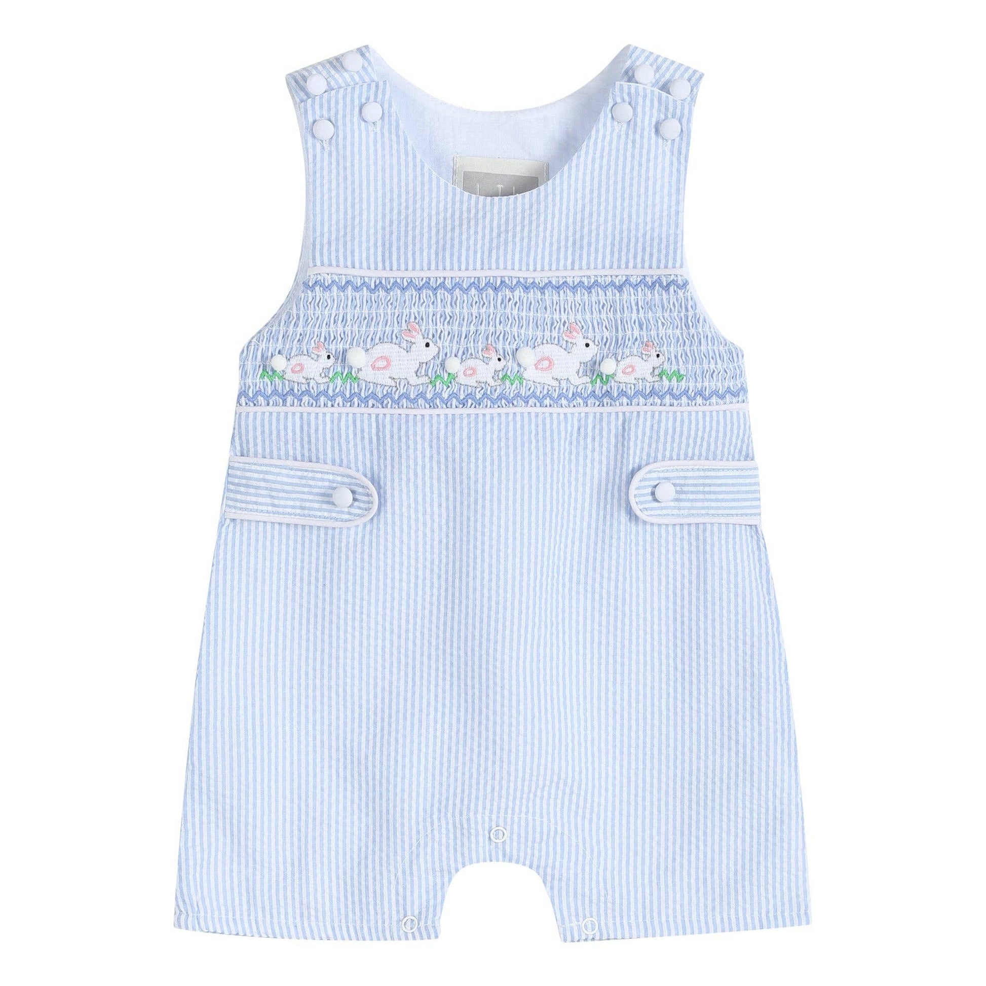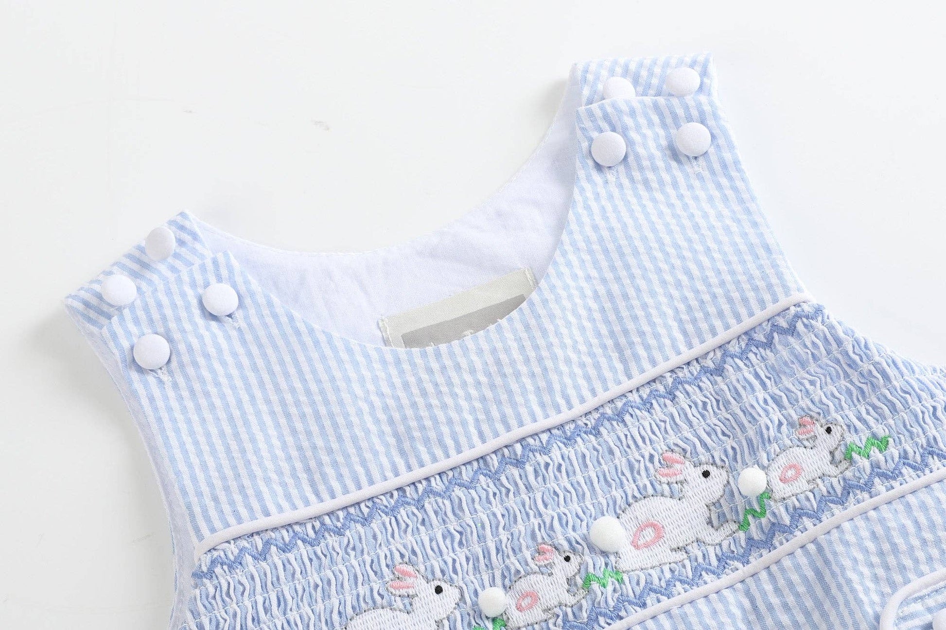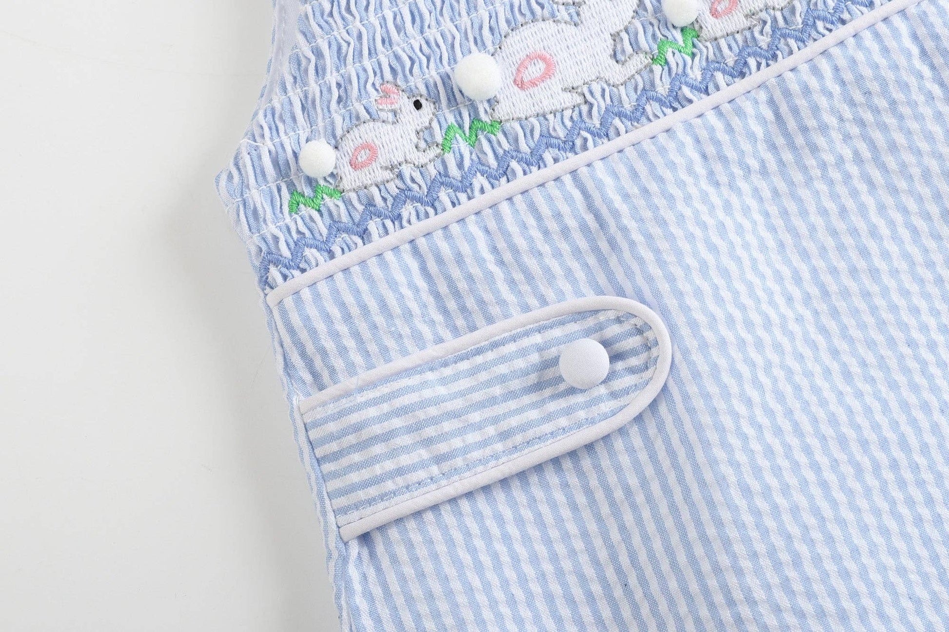 Bunny-tastic! He'll be irresistible in this adorable Bunny themed Shortalls. Made in a blue seersucker 100% soft cotton to ensure all day comfort. Features a charming bunny embroidery on smocking, coordinating 2-button closure for sizing adjustments and snaps for easy diaper changes. Your little boy will be perfectly dressed (and camera ready!) for all your Easter adventures.