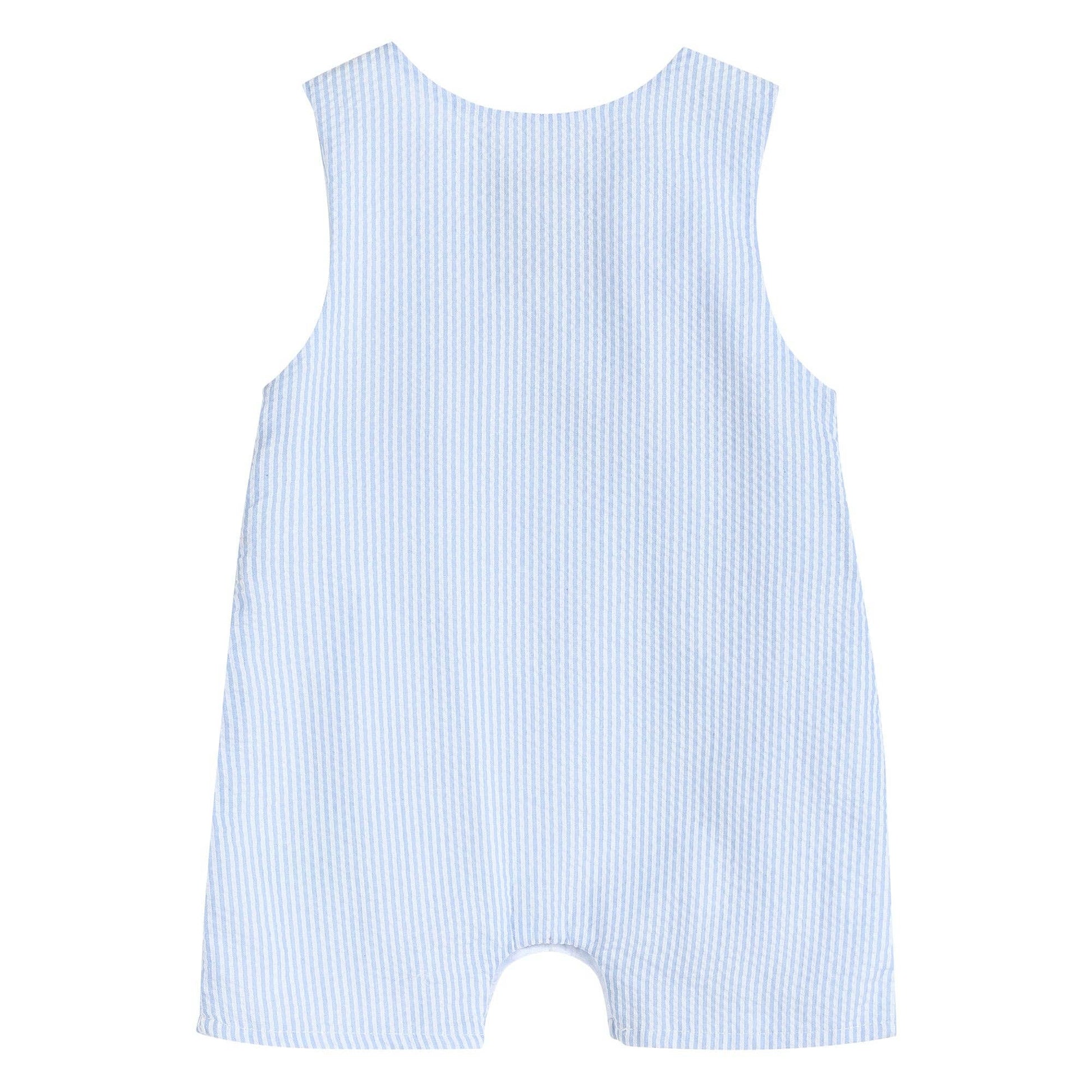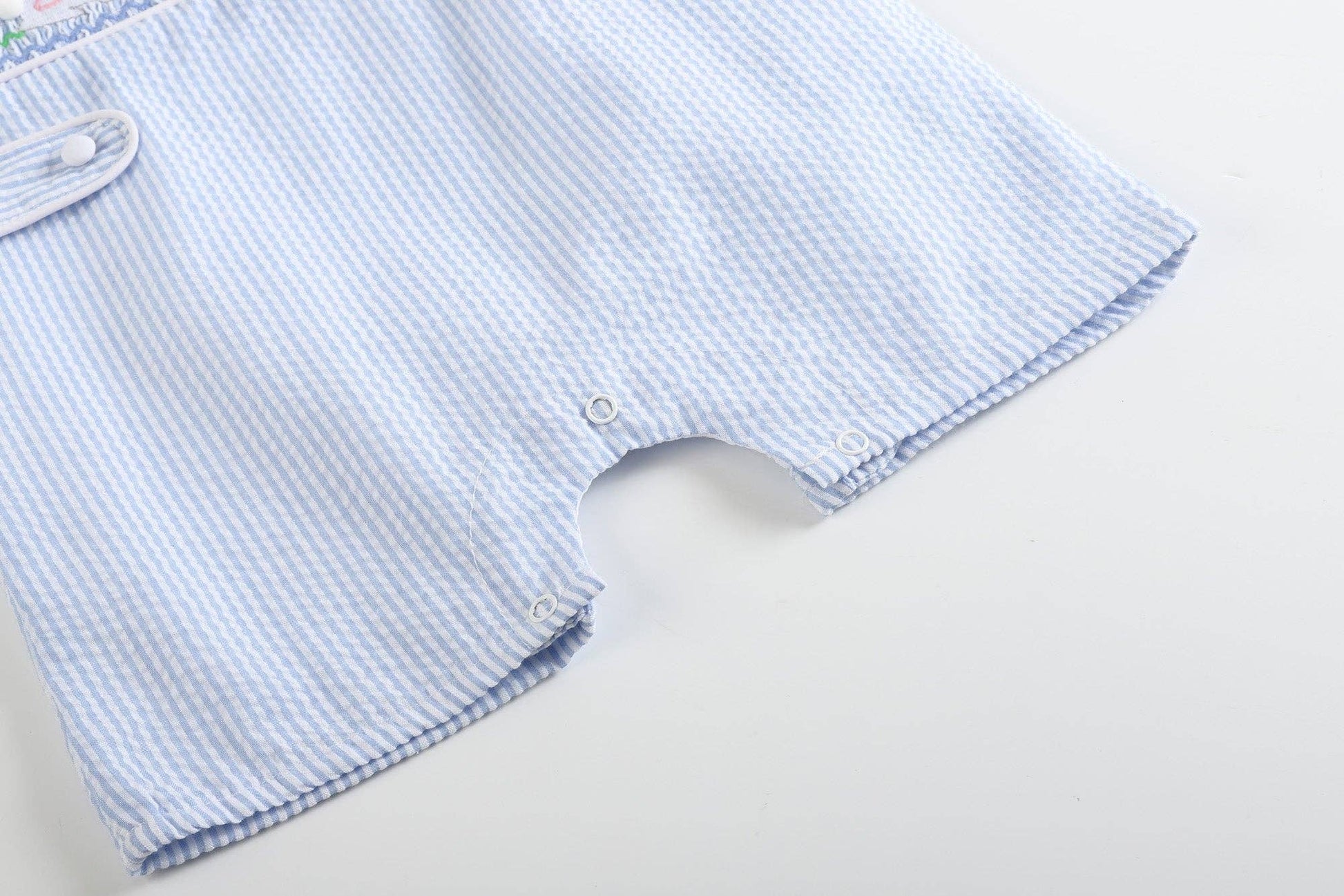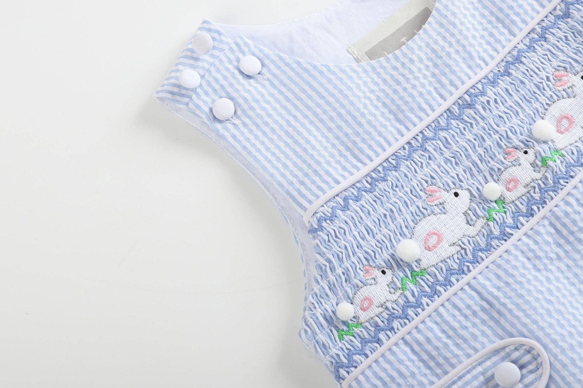 Bunny-tastic! He'll be irresistible in this adorable Bunny themed Shortalls. Made in a blue seersucker 100% soft cotton to ensure all day comfort. Features a charming bunny embroidery on smocking, coordinating 2-button closure for sizing adjustments and snaps for easy diaper changes. Your little boy will be perfectly dressed (and camera ready!) for all your Easter adventures.