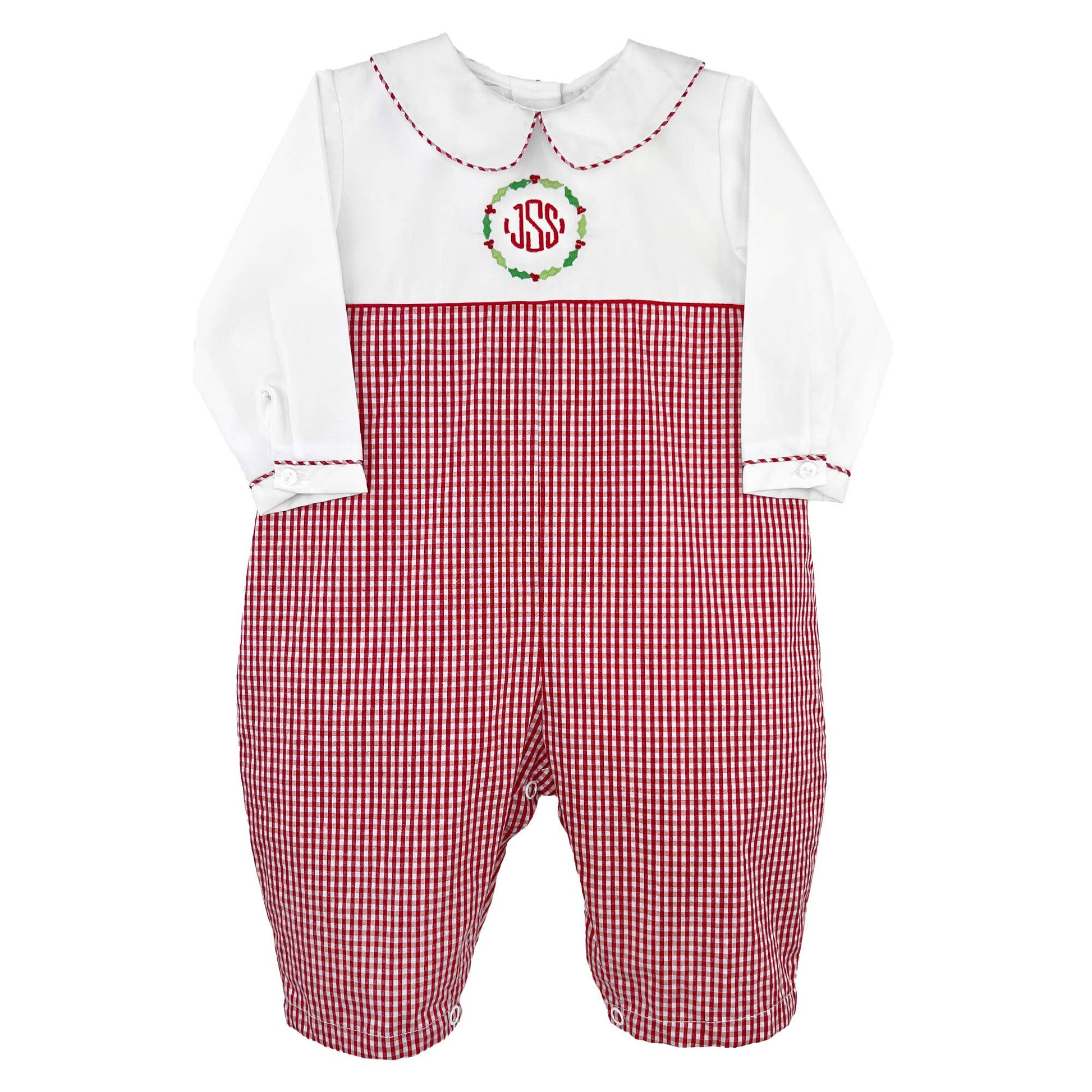 This holiday long sleeve romper comes with a white top with an embroidered Christmas wreath and red check skirt with peter pan collar with red trim. The center of the wreath is also perfect for monogramming!