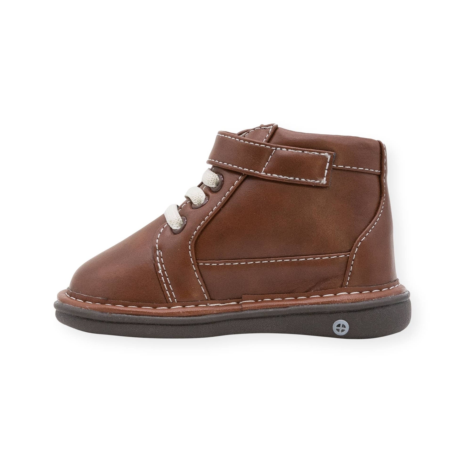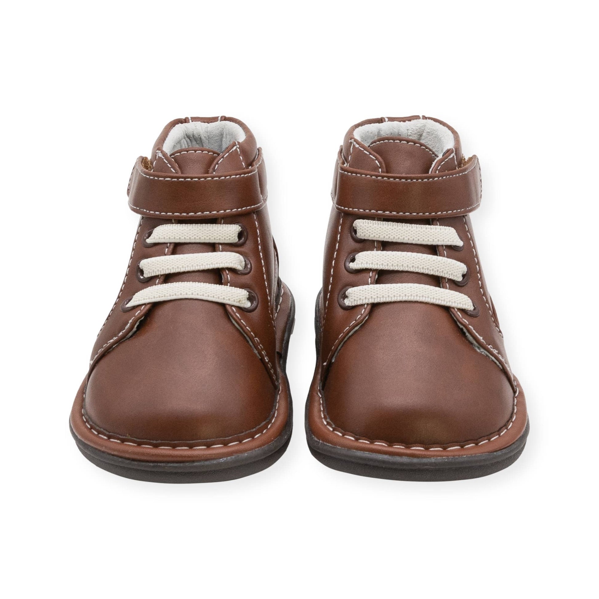 You can never go wrong with a classic brown boot! Roomy fit, soft lining, supportive footbeds, faux laces, and an adjustable velcro strap. He’ll enjoy playing in them and you’ll love their durability and convenient on/off style. Color: brown.