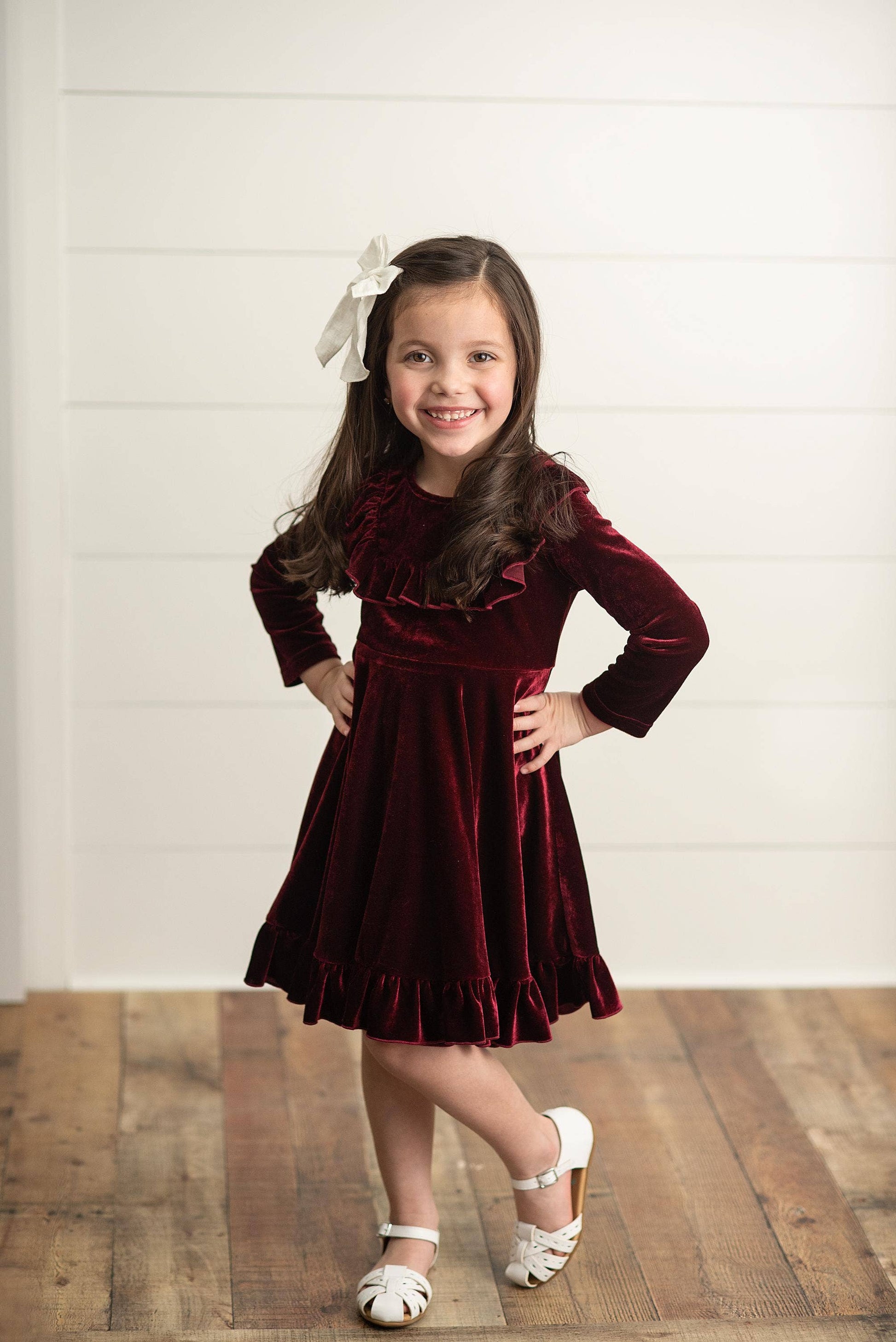 Kids Wine Velvet Ruffle Fancy Winter Christmas Holiday Dress