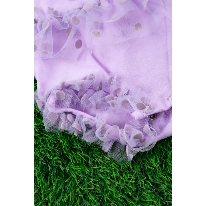 Experience the joy of dressing your baby in the Purple Polka Dot Sheer Material Baby Onesie from Kids Charm Online. This delightful onesie is adorned with playful polka dots, providing a timeless style for your little one. As part of our bodysuit collection, this onesie offers easy dressing and changing, thanks to its practical design.